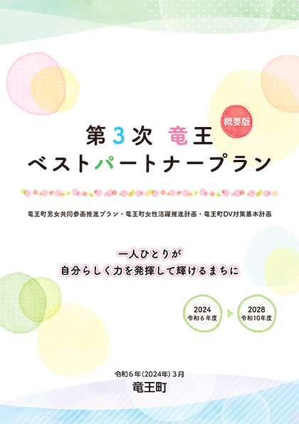 そこで、これまでの取組を引き継ぐとともに、あらゆる分野において女性の活躍を支援するための新たな計画として、第3次竜王町男女共同参画推進計画「竜王ベストパートナープラン」を策定しました。